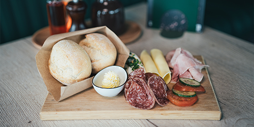 2 Brötchen | handgeschnittene Wurst- und Käseauswahl | gekochtes Ei | Butter