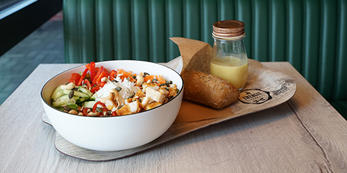 Unsere Salate werden mit einem knackigen Salatmix und Dressing nach Wahl zubereitet und mit einer Bauernkruste serviert